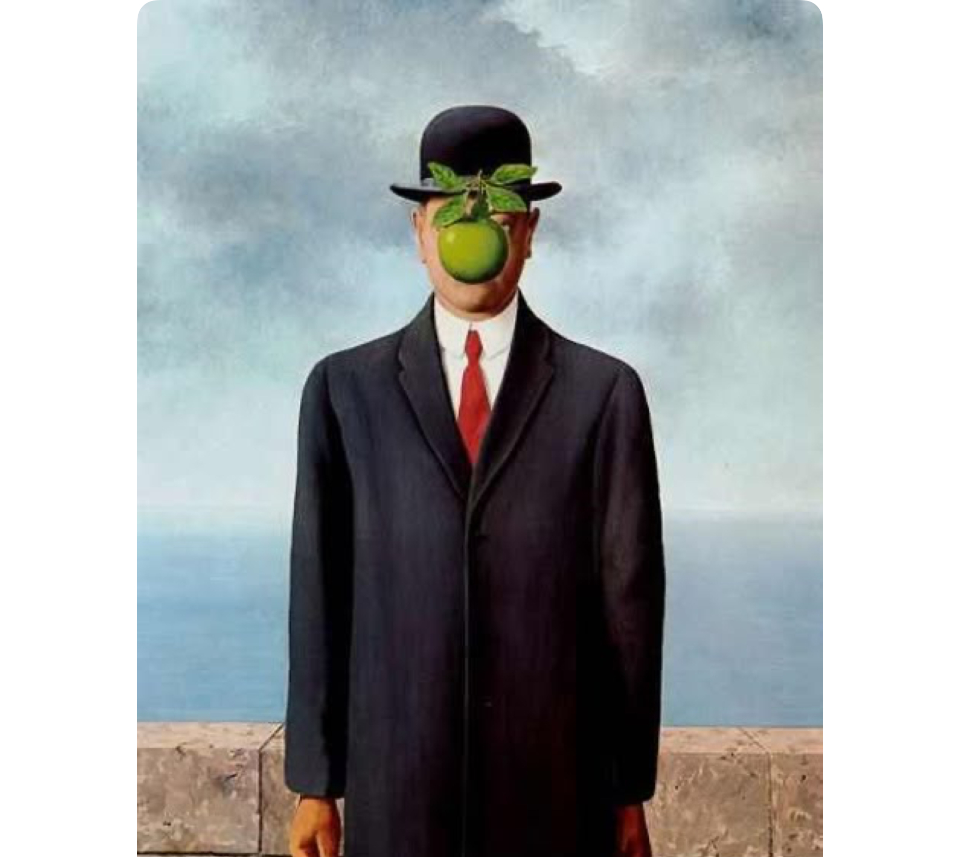 In The Son of Man, a man stands facing us, his face hidden behind a floating green apple. It’s a simple gesture, but it lingers. We instinctively want to see his face, to complete the image. But Magritte doesn’t allow that. He leaves the moment unresolved.